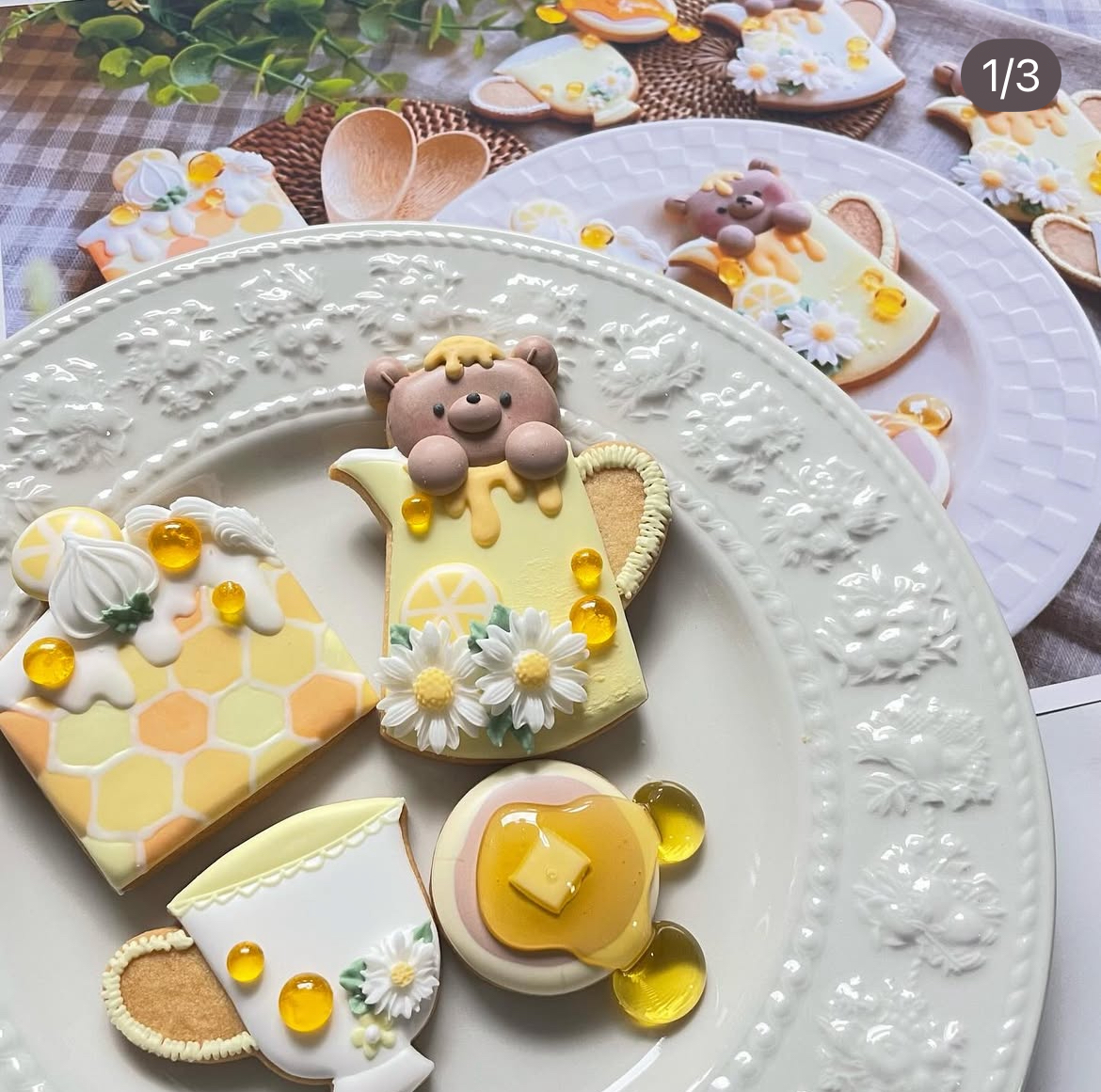 ぽってり可愛いくまさんが顔をだすポットにレモンティーカップ、ハニカム模様のはちみつれもんケーキとはちみつとろ〜りのパンケーキ、見ているだけで癒される、ティータイムをぎゅっと詰め込んだ、お菓子のおうち松沼ゆき先生デザインのとびきり可愛いクッキーたちです。