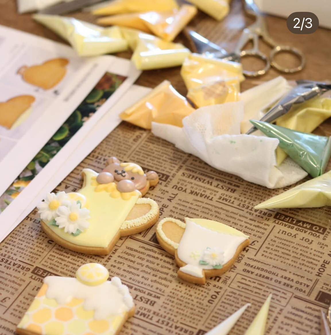 アイシングクリームの作成、着色、お花の飾りや、レモンのパーツ、は講師が準備していますので、デコレーションのみを楽しんでいただけます。